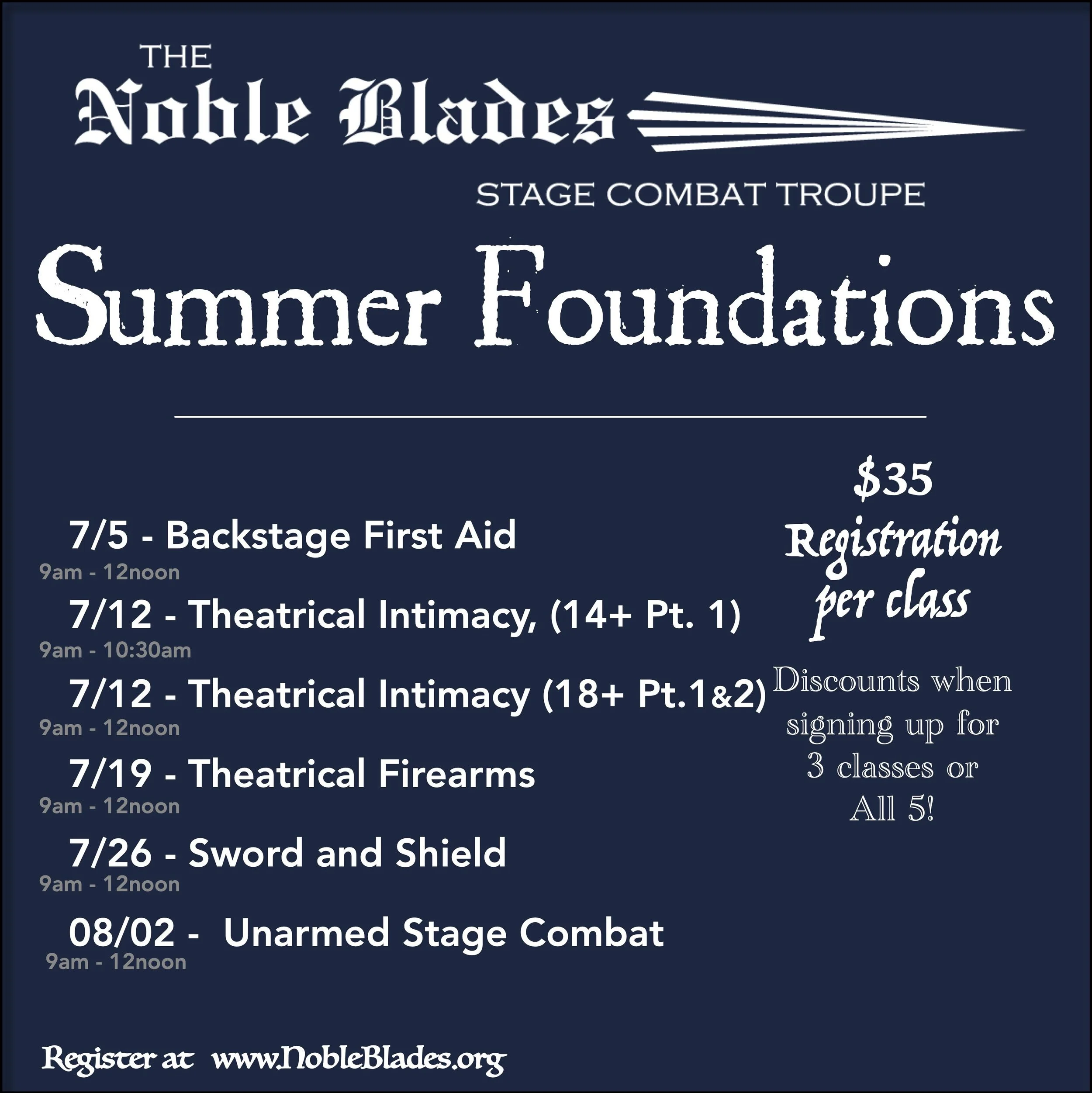 Noble Blades host an annual Summer Foundation series. Perfect for beginners, as a refresher class, or just back to basics fundamentals. Over the course of five classes, we’ll cover many of the basics of stage combat. From Unarmed, to Swordplay, to even Theatrical Firearms.